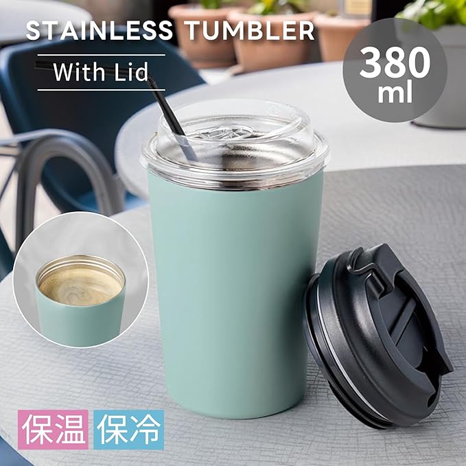 ステンレス タンブラー リッド付き | 蓋付き コンビニマグ テイクアウト カップ 真空断熱 保冷保温 広口 ステンレス製 コーヒーカップ (ブラック, 380ml)