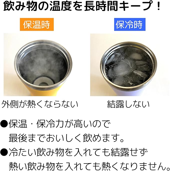 保冷効力:10℃以下(6時間)、保温効力:47℃以上(6時間)、最後まで美味しく飲める保温保冷力。