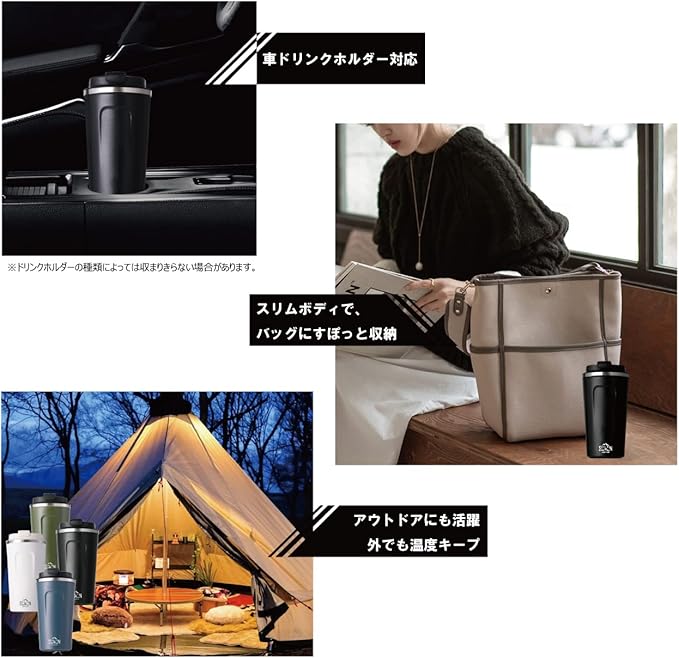 真空断熱構造で、外からの熱を伝えにくく、保温・保冷効果が長続きします。 蓋つきタイプで、カフェタンブラーデザインの飲み口付きで、直飲みもできます。 タンブラー底裏に滑り止め構造で、家・オフィスにも安心して使っていただけます。 さらに密封性があり、持ち運びにも便利で、コンビニ・カフェ・キャンプにもいろなシーンで活躍できます。