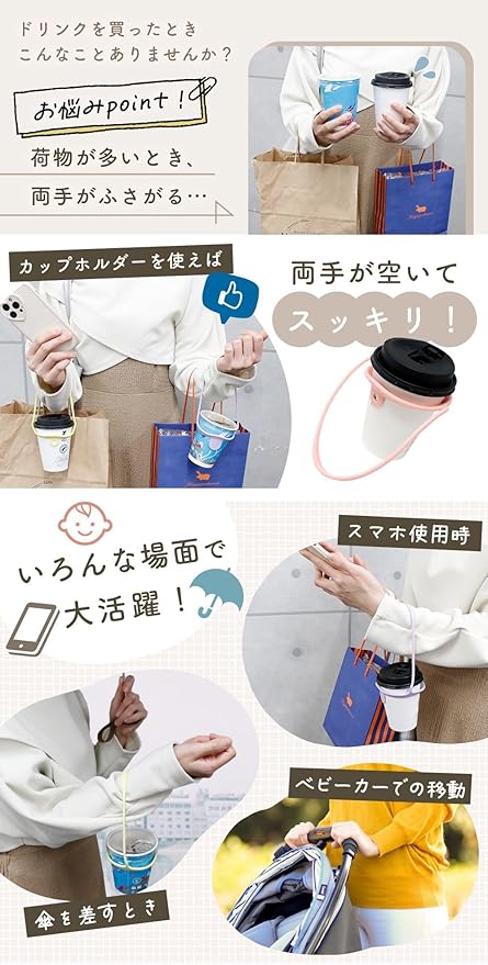 多用途ドリンクホルダー:ベビーカーなどに取り付けて使えるコップホルダー。テイクアウトやコンビニコーヒー、アウトドアやスポーツ観戦に最適。