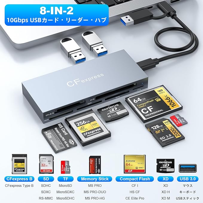 CFexpress Type bカードリーダー 8-in-1 SDカードリーダー タイプc CFカードリーダー Type-C & USB 3.0 超高速転送 OTG対応 SD/TF/microsd/CF/XDメモリカードリーダー iPhone/Windows・Mac・Linux・AndroidマルチOS対応
