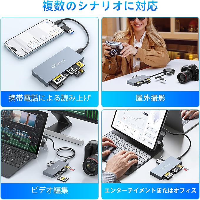 【幅広い互換性】CFexpress Type B/SD(SD/SDXC/SDHC/RS-MMC)/TF(microSD/microSDXC/microSDHC)/CF(CF I/HS CF/CF Elite Pro)/MS(MS Pro/Pro-Duo/Pro-HG)/XDカードに対応。最大2TBのCFexpressカードとUSBストレージデバイスの読み取りをサポート。Mac/Chrome OS/Linux/Android/Windows XP~11以降のOSでドライバ不要。
