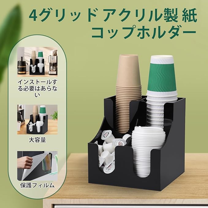 使い捨てカップディスペンサー 紙コップホルダー カップスリーブホルダー 4グリッド アクリル製 業務用