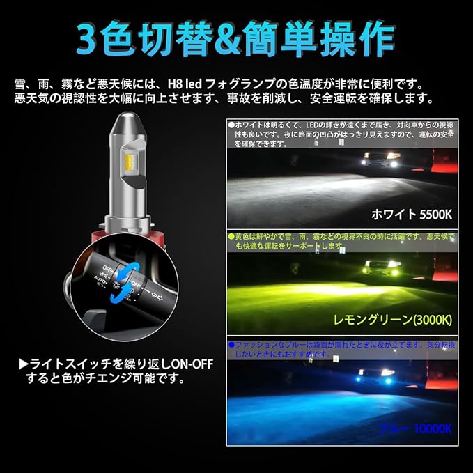 ▶3色切替&簡単操作:雪、雨、霧などの悪天候にも安全運転できるよう、自由に 3色切替えできる製品が登場。切替は運転席内でのフォグ ランプのスイッチをON/OFFで色の切り替えができます。 3000Kのレモングリーンは雨、雪、霧などの悪天候にも高い視認性を確保、 6000Kのホワイトは夜に最も道を見やすく、通常の天気にはっきりと超広い視野を確保できます。10000Kファッションなブルーは路面が濡れたときに役が立てます。気分転換したいときにもおすすめです。