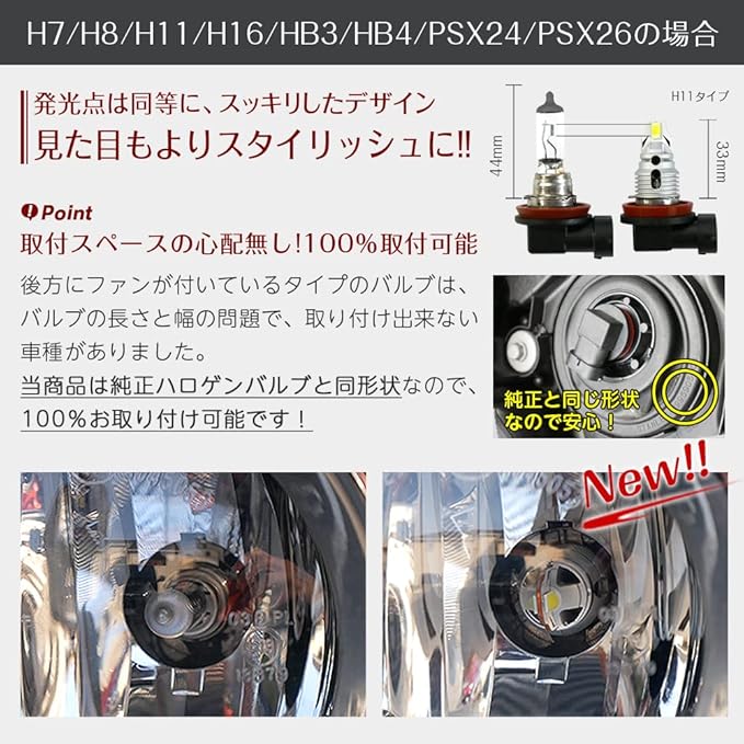 【取付スペースの心配無し!100%取付可能】後方にファンが付いているタイプのバルブは、バルブの長さと幅の問題で、取り付け出来ない車種がありました。当商品は純正ハロゲンバルブと同形状なので、100%お取り付け可能です!