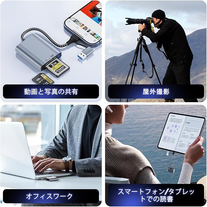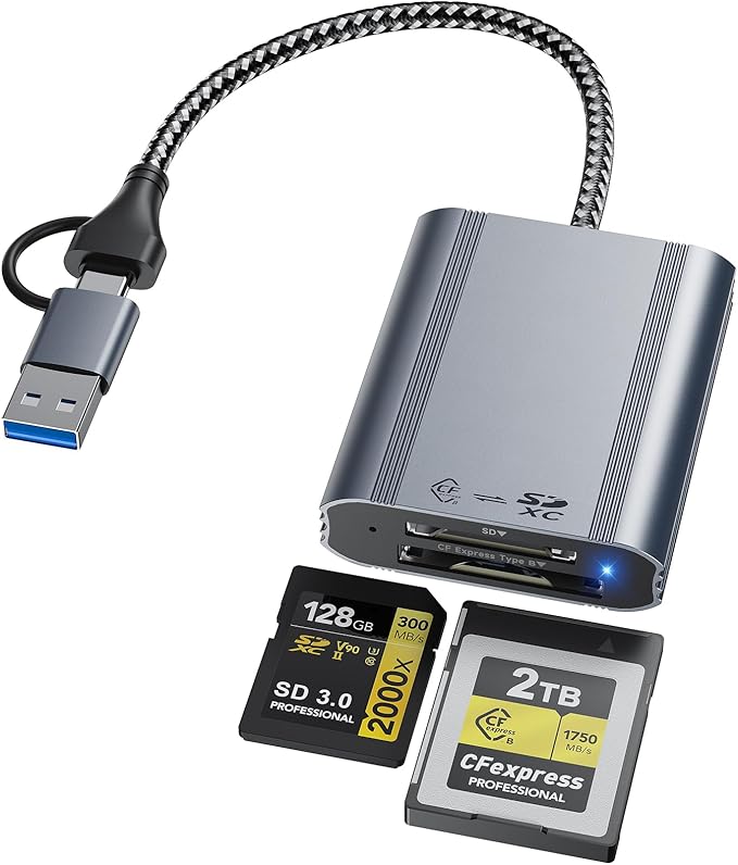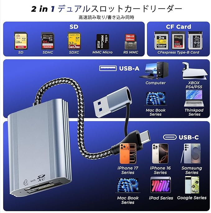 【プラグアンドプレイ】追加のドライバーやソフトウェアのインストールは不要です。このcf sd カードリーダーーをデバイスに接続するだけで、すぐにファイルの転送を開始できます。最大 2TB のカード容量をサポートし、すべての cfexpress タイプ b および SD カメラカードと簡単に互換性があります。写真/ビデオをデバイスに簡単かつ迅速に転送し、カメラの画像/ビデオをどこからでもソーシャルメディアで共有できます。外出先でもデジタルコンテンツを簡単に管理できます。