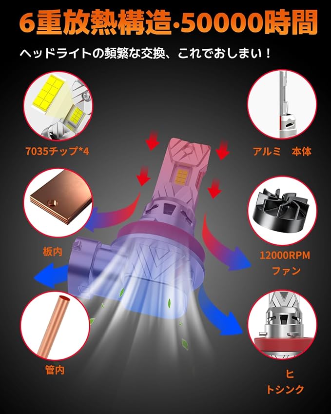 『6重冷却』新しいH11 LEDに交換しても明るさに満足できない?期待通りの明るさを持つランプを素早く選ぶコツをお教えします。ヘッドライトの放熱効率が高いほど、明るさは増します。当社H11 LEDは高熱伝導性6063航空アルミ合金素材を採用し、内蔵120000rpm冷却ファン、1本の放熱銅管、1枚の高効率熱伝導銅板、通気溝設計により4重冷却を実現!放熱効率が4倍大幅向上!過酷な環境下でも、H11 led車検認証モデルは安定した発光を維持し、安全運転を守ります。
