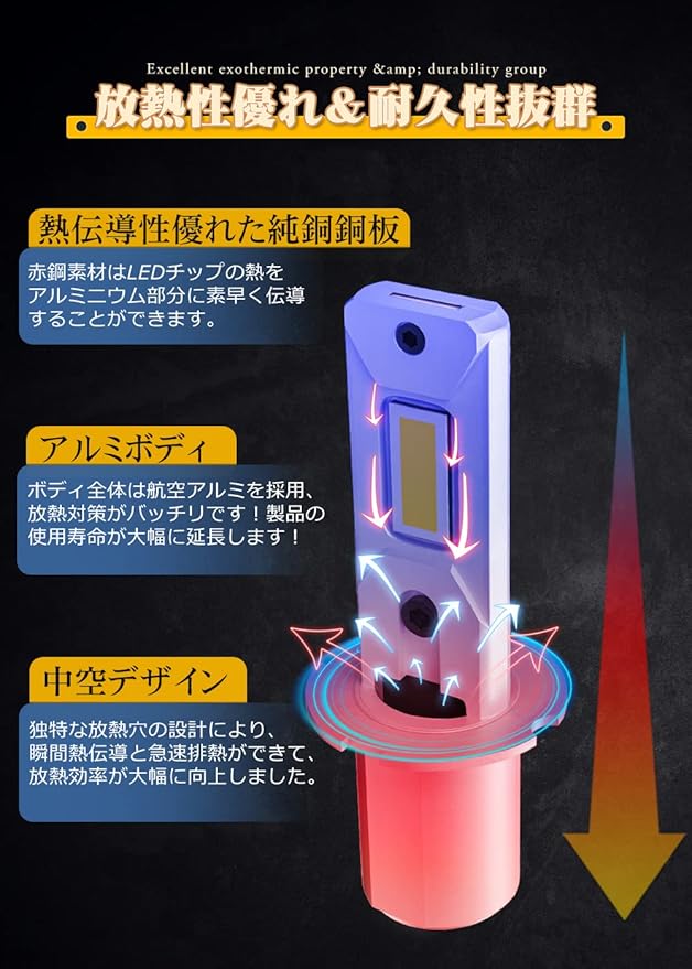【ファンレス&放熱性優れ・耐久性抜群】LEDフォグランプは放熱性能に優れた航空アルミ合金を採用、超コンパクト、ポン付けタイプがファンレスになりました!故障の原因となりやすいファンがありません。ファンがないため、騒音などは一切ありません。一体式アルミハウジングを採用し、放熱対策がバッチリです!それに、銅芯PCB基板を採用、熱伝導性能が優れる!独特な放熱穴の設計により、瞬間熱伝導と急速排熱ができて、放熱効率が大幅に向上しました。バルブの寿命を効果的に延長します。また高品質LEDチップを採用しているので、光減衰現象が発生しにくいです、放熱問題を解決した同時に正常な発光状態を維持できます。