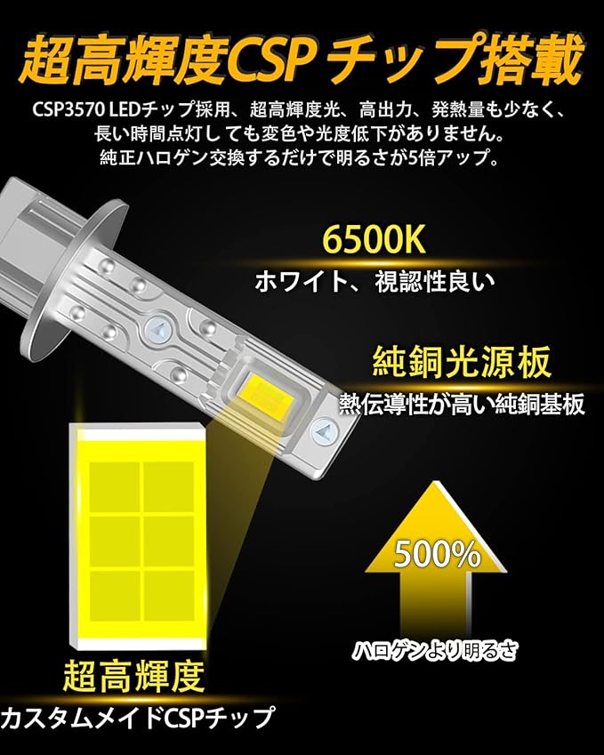 【超高輝度】CSP3570 LEDチップ採用、超高輝度光、高出力、高効事で照射範囲は広い上、発熱量も少なく、長い時間点灯しても変色や光度低下がありません。純正ハロゲン交換するだけで明るさが5倍アップ。高性能定電流保護回路搭載。LEDの明るさを一定に保ち安定して動作させる。LEDの輝度を安定させて動作させ、LEDチップの寿命を延長させる。瞬間的に起働し、点灯することができる。性能安定のための最適な選択を求める。