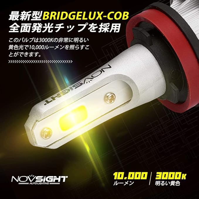 NOVSIGHT【正規保証品】 led ヘッドライト H8/H9/H11/H16(国産車対応) LEDバルブ フォグランプ イエロー 高性能のチップ搭載 取り付け簡単 10000LM(5000LM*2) 72W(36W*2) 明るく高輝度 DC9-32V車対応 3000K 販売者2年保証 (イエロー 2個入)