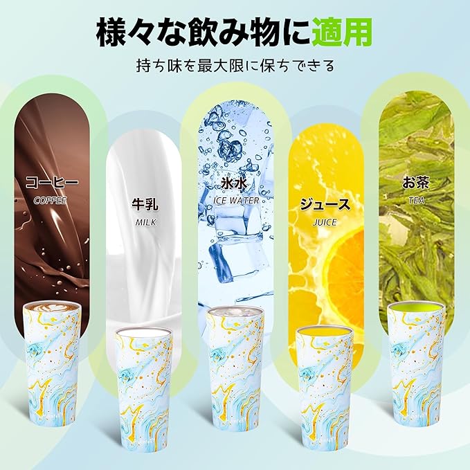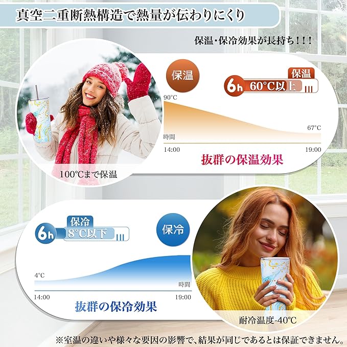 【高品質な保温保冷技術】二重構造の真空断熱で、飲み物の温度を6時間以上キープ。冷水は0度以下、温かい飲み物は60度以上を持続し、季節問わず最適な温度を楽しめます。こぼれないデザインで携帯性も抜群