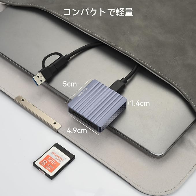 【コンパクトで持ち運びに便利な設計】このカードリーダーは、わずか 5cm 4.9cm 1.4cm のコンパクトなデザインで、軽量で持ち運びに便利です。バックパック、カメラバッグ、ポケットなどに入れても、負担なく簡単に持ち運べます。この設計は、撮影や旅行で頻繁に外出するプロフェッショナルに特に適しており、メモリ カードを接続して、必要なときにいつでもデータのバックアップと転送を行うことができます。