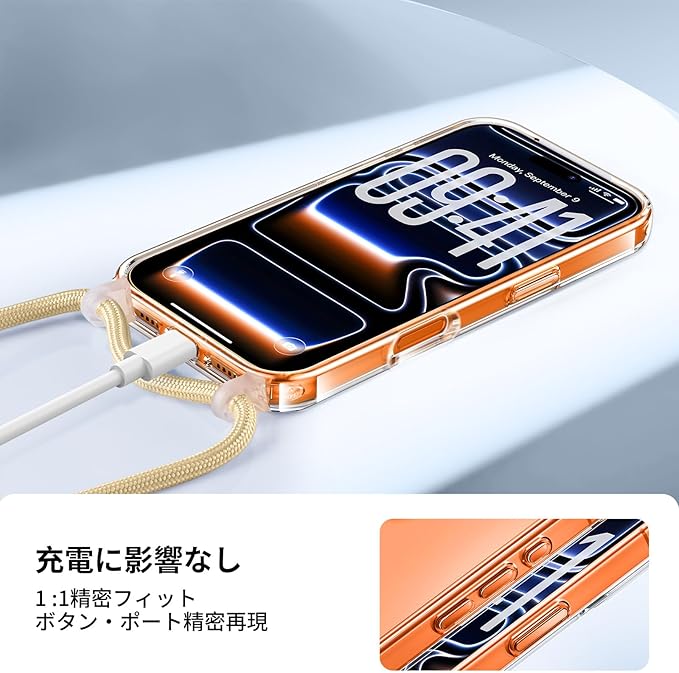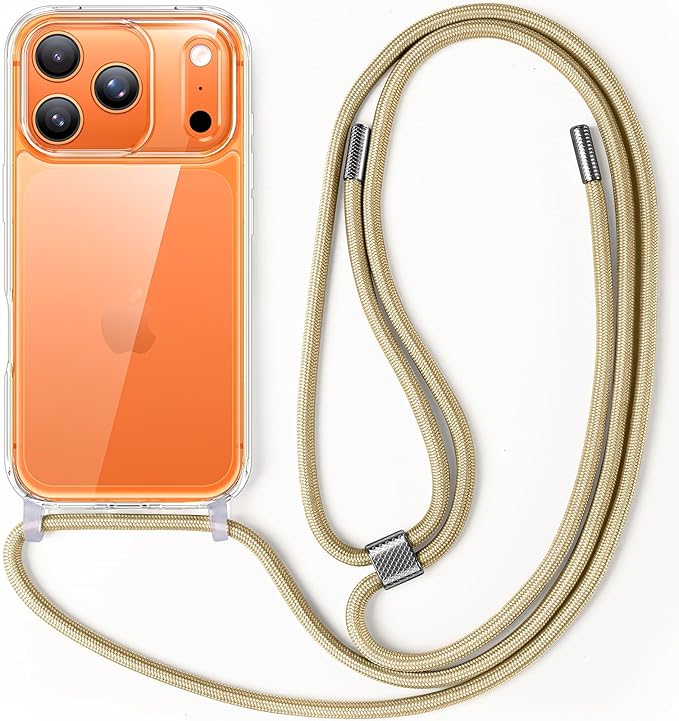 Aunote 対応 いPhone17promax ケース 薄型 軽量 耐衝撃 携帯 紐付き 斜めがけ 織りストラップ付き ネックストラップ ショルダー長さ調整可能 落下防止 紛失防止 対応 iPhone 17 Pro Maxケース クリア+デザートゴールド ショルダース