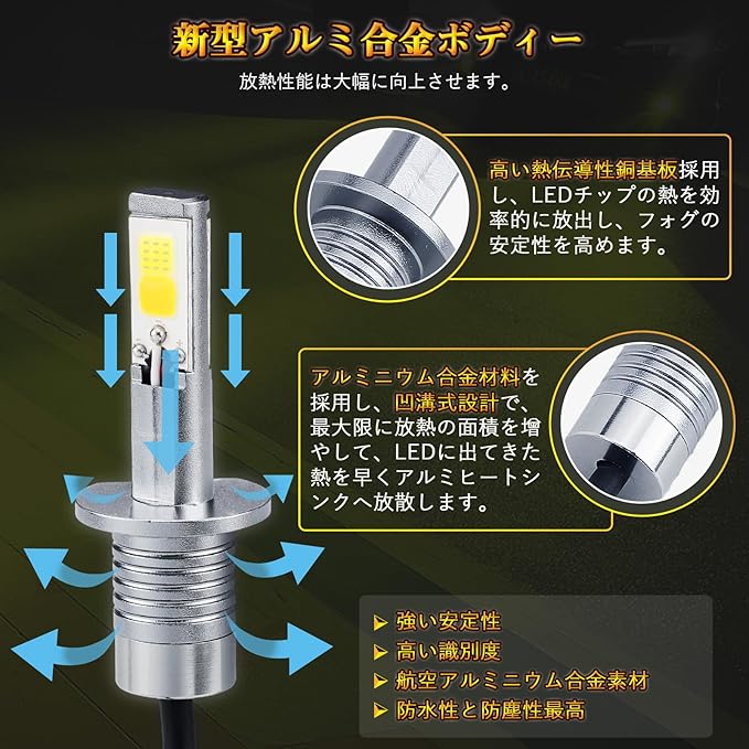 【放熱対策】新型アルミ合金ボディーを採用、凹溝式設計、放熱面積を増やして、放熱性能は大幅に向上させる。高温にも耐えられる非常に優れた耐熱性・放熱性を実現!
