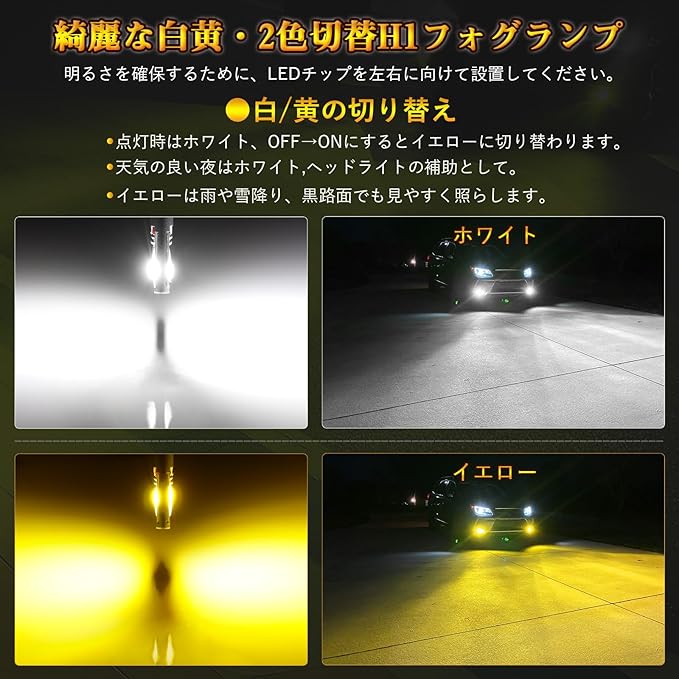 LEDフォグランプ H1 ホワイト イエロー 2色切替 黄 3000K 白 6000K フォグ ランプ H1 爆光 電球 純正交換 LEDバルブ 12V 車用 COBチップ搭載 2800LM ファンレス 2個セット