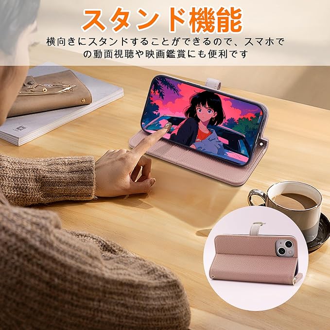 【便利なスタンド機能】動画視聴の需要にお応えしてケースは横向きのスタンドにもなるなど、機能性も優秀な手帳型ケースとなっています。両手が解放さ好きな角度で動画鑑賞や読書などを楽しめます。