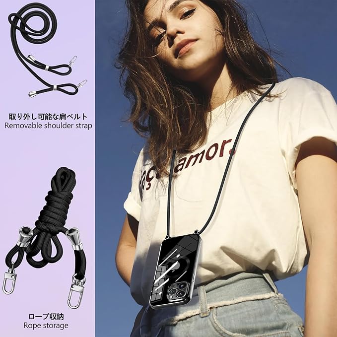 iPhone 16 Pro Max 用 ケース クリア ショルダー 耐衝撃 アイフォン 16 プロ マックス 用 ケース Magnetic対応 ストラップホール付き 肩掛け 紐付き TPU 斜めかけ 縄掛けケース 長さ調整可能 取り外し可能 落下防止 紛失防止 軽量 一体型 ワイヤレス充電対応 メッキ加工 アイフォン 用 カバー 黒 W-CXKS-10-01