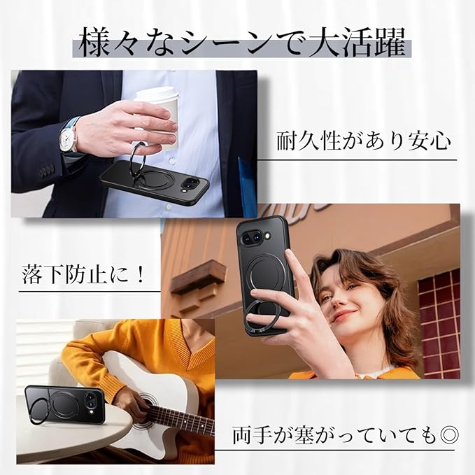 Google Pixel 9a用 ケース MagSafe対応 リング付き 360 回転スタンド 半透明マット 耐衝撃 カメラ保護 ワイヤレス充電対応 指紋防止 黄ばみ防止 ストラップホール付 グーグルピクセル9a カバー (ブラック)