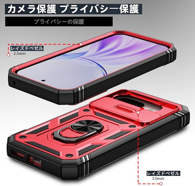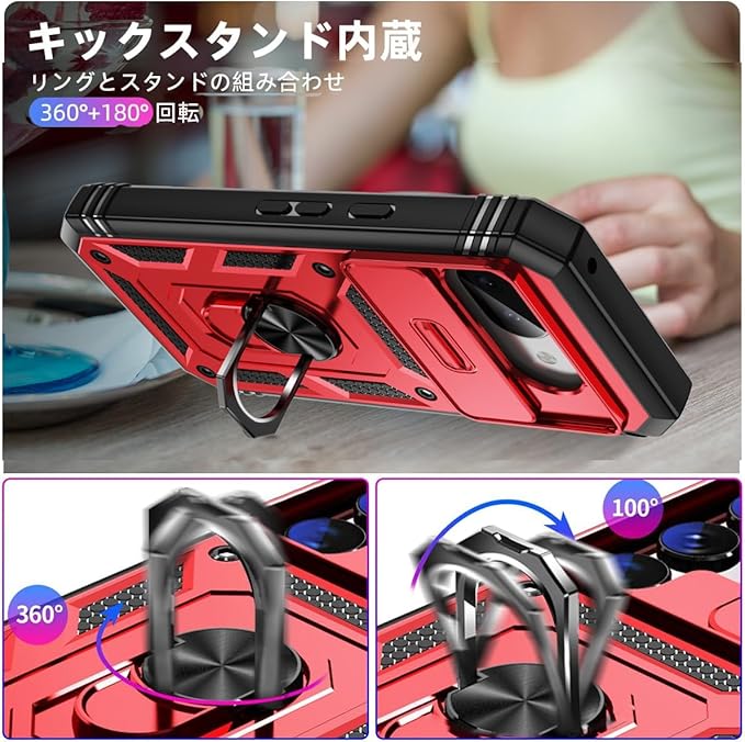 Google Pixel 9a ケース用, グーグルピクセル9a ケース googleピクセル9a スマホケース pixel9a 携帯ケース 360 回転 メタルリング スタンド機能 車載ホルダー対応 耐衝撃 横置き機能 Case Cover ぐーくるぴくせる9a pixel9a 背面 カバー 6.3インチ(赤 レッド)