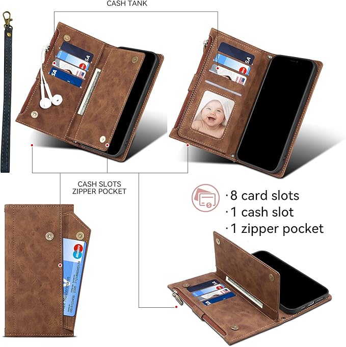 【収納力抜群】 :便利なカードポケットがついているから、ケースの中にはカードを9枚収納できるカードポ、紙幣など収納できるポケットがあります。ファスナーポケットも付きて、月票、現金、名刺、ICカード、Dカード、や運転免許証、交通カード、クレジットカード、などが収納でき、イヤホンなども、カードを持ち運びしカードスロット設計のビジネスウォレットはシンプルで便利