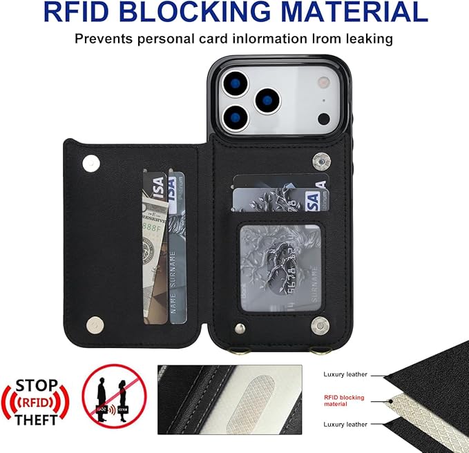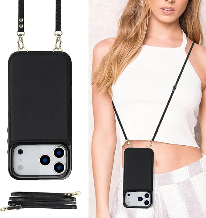 適用 iphone 17 pro Max ケース ショルダー 窓口式 カード入れ スマホケース ストラップ付き アイフォン17プロマックス カバー 手帳型 斜めがけ 可愛い iphone17proMax ショルダーケース 首かけ 肩掛け かわいい おしゃれ RFIDスキミング防止機能 ロング クロスボディ 携帯カバー ブラック