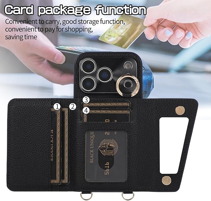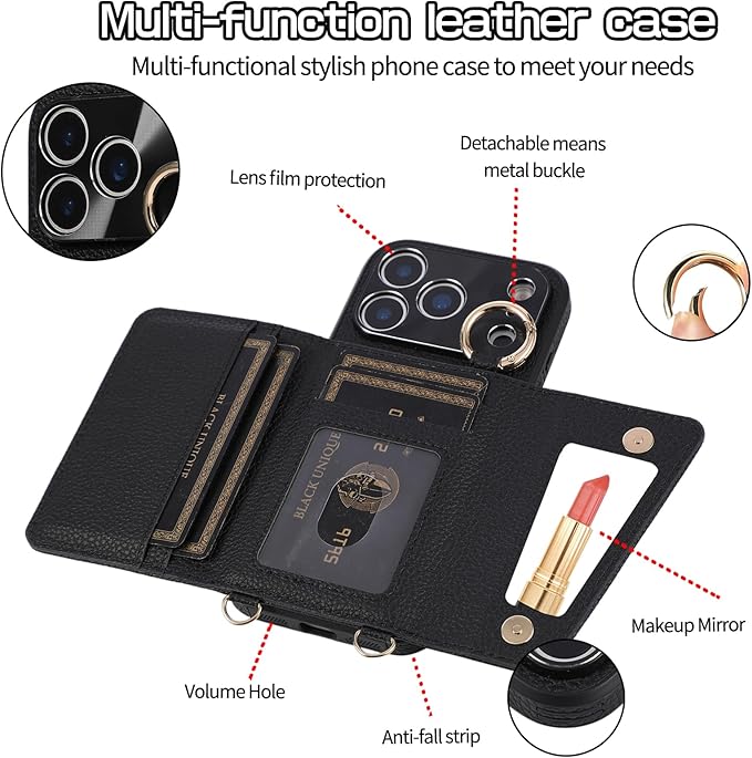 Pelanty 縄掛けケース For iPhone 17 Pro Max 手帳型ケース for iPhone17 Pro Max ケースリング 携帯カバー 肩掛け斜めがけショルダー ストラップ付き PUレザー+TPU アイフォン17プロ Max 背面カバー お札入れ小銭入れ 財布型ICカード収納 スタンド機能 ボタン磁気 耐衝撃 落下防止 ブラック