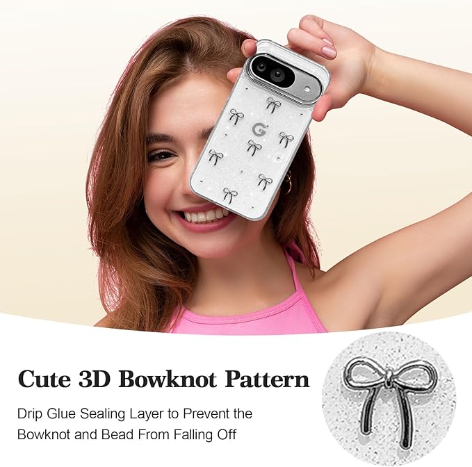 EYZUTAK ケース 対応 Google Pixel 9a 用の 保護ケースおしゃれ 可愛い 韓国 クリア りぼん立体感装飾 きらきら ラメ入り 透明TPU薄型 軽量 耐衝撃 擦り傷防止 保護カバー - 銀色のリボン