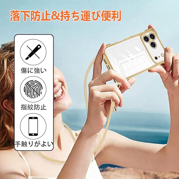 【モデルにぴったりフィット】iphone 17 Pro Max 専用に設計され、充電ポート、操作ボタン、スピーカーの各カットアウト位置が高精度で合致します。ケース装着時も充電作業、ボタン操作、音声出力がスムーズに行え、機器をしっかり固定しながらも使い勝手を最大限に保ちます。ご購入前に、ご使用のスマホモデルを必ず確認してください。【取り外し可能なストラップ 利便性に優れる】ケース側面に専用のストラップ取り付け部を設け、付属のナイロン製ストラップを簡単に装着・取り外しできる構造となっています。ストラップは適度な強度と柔らかさを備え、長時間使用しても首や手に負担がかかりにくく;外出時にストラップを装着することでスマホの落下を防ぎ、バッグのフックに掛けて持ち運ぶことも可能です。使用シーンに合わせてストラップの有無を切り替えられ、日常の使い勝手を大幅に向上させます。【高い透明感】高品質 TPU を使用し、一般的な保護ケースより透明度が高く、スマホの本来のデザインと色合いをそのまま楽しめます。クリアケースの裏面には、家族やペットの写真、お気に入りのシールなどを入れて、自分好みのアレンジが可能です。【カメラ周り全方位防護 キズを徹底回避】カメラモジュールの周囲にケース背面表面より 0.5mm 盛り上がった防護リムを一体成型し、机やテーブルなどの平面にスマホを置いた際に、カメラレンズが直接接触面に触れるのを完全に防ぎます。防護リム部分は高硬度 TPU 素材で補強され、摩擦や砂埃・金属粉などの異物によるレンズのキズを回避するだけでなく、落下時の衝撃からカメラモジュールも保護します。