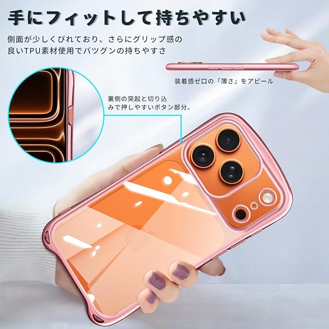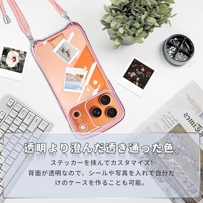 iPhone 17 Pro Max 用の ケース ショルダー ストラップ iPhone17ProMax 用の カバー クリア 肩掛け 斜めかけ 韓国 アイフォン17ProMax 用 透明 スマホケース (ローズゴールド)