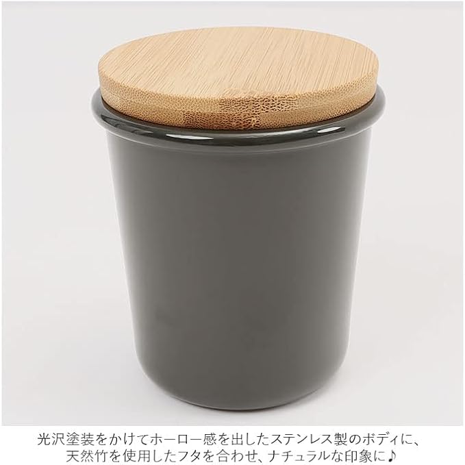 光沢塗装をかけてホーロー感を演出。飲み口は口当たりの良い丸みのあるデザイン。付属の竹蓋を被せることでほこりの侵入を防ぐことができます。