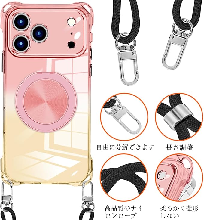 iphone 17Pro ケース クリア magsafe対応対応 リング ストラップ 360度回転 落下防止 アイフォン 17 pro 耐衝撃 アンカー構造 携帯ケース マグセーフ リング付き ショルダーストラップ 肩掛け いphone 17 プロ カバー 透明 カメラ保護 おしゃれ 純正 グラデーション