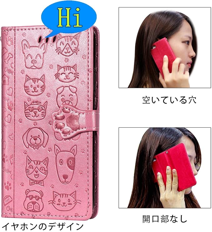 かわいいデザイン:犬と猫の可愛らしい動物柄がエンボス加工されたピンク色のPUレザー素材で、肉球や魚の骨などの愛らしいモチーフ付き