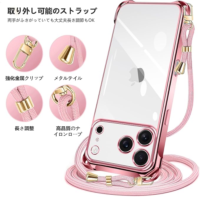 iphone 17 pro max 用の ケース 2025年発売 クリア ネック ショルダー いphone 17 pro max ケース 耐衝撃 ストラップ付き アイフォン17 pro max カバー 透明 TPU スマホ シリコン カバー 紐付き 斜めがけ 織りストラップ付き 肩掛け 縦/横 2WAY 調節可能な クロスボディ 多目的キャリー(ローズゴールド)