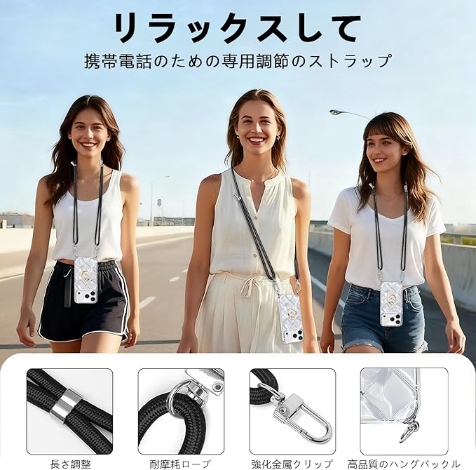 【クロスボデ縄】①柔らかいナイロンストラップで首を快適に保ち、ストレッチの長さを調整でき、ストラップを取り外して、電話ケースを単独で使用できます。ストラップの全長は1.5メートルですケースにもチェーンが1本付いて、小さな穴を通ってケースとつながって固定しています。このようにあなたは快適に携帯電話を首にかけることができます!②ネックストラップ付きのスマホを首掛け・肩掛け・斜掛けしてハンズフリーできるだけでなく、外でご愛用のスマホの紛失も防止します。外出、普段使用にとても便利です。直径約8 mmで高品質なロープの端は金属製である。調節可能なロープは両手を放します,可斜めがけ、可肩掛け、ショルダーバッグは任意の長さまでロープをかけることができます。③下部に取り外し可能なストラップ取り付け金具付き、落下防止に役立ちし、使用中に邪魔しなくてとても便利です。