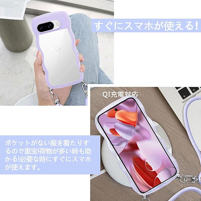 Google Pixel 9a 用の ケース クリア ショルダー グーグル ピクセル9a スマホケース 透明 TPU カバー ストラップ付き 肩掛け 首掛け 紐付き 斜めがけ 創意 個性 可愛い かわいい 韓国 耐衝撃(クローブ 紫)