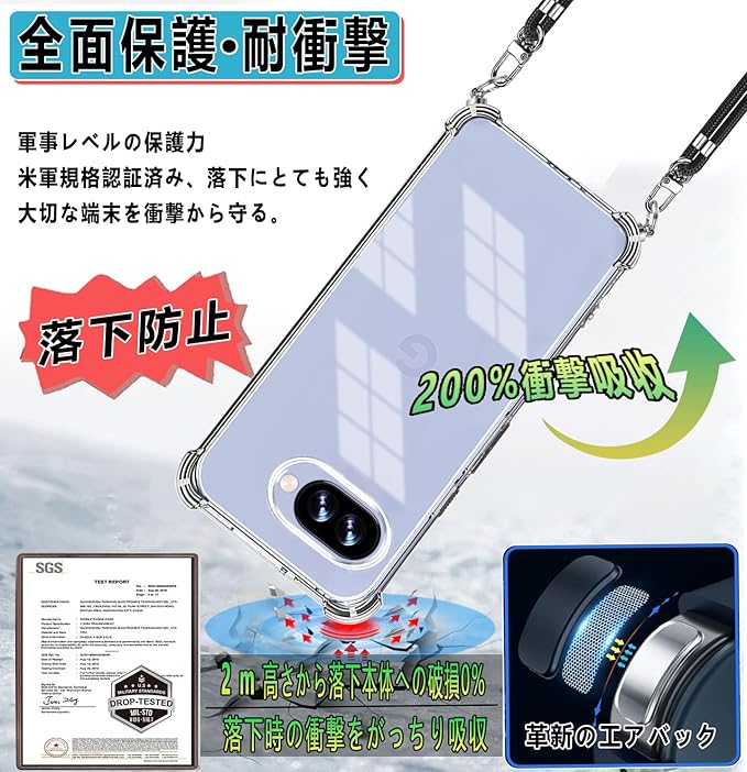 【耐衝撃 & 米軍MIL規格の取得 & ストラップホール付き】その耐衝撃性能は第三者機関の試験による米軍MIL規格をクリアするほど高いことが証明されております。 Google Pixel 9A ケースの四隅部分に"衝撃吸収テクノロジー"を採用し、これにより角からの衝撃を受けてもその隙間がクッションの様に本体への衝撃を吸収します。万が一スマホを落としてしまった場合でも、落下時のダメージを最小限に抑えることが可能となっており。バンパーはしなやかな感触で手に吸い付くので滑り難しく、落下の防止に大きく貢献できるので安心!