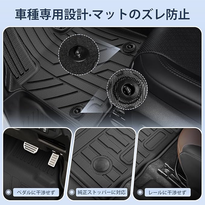 2.【専用設計&安心装着】ACE LIGHTINGの3Dマットは運転の安全を配慮した40アルファード専用の純正のストッパーに対応するホールを採用し、マットズレや移動を防ぎます。車内の構造にぴったりフィットする車種専用設計により、ペダルと座席のスライドレールに干渉せず。取り付け後も滑ることがなく、しっかりとした安定感を提供できます。安全性とフィット感を重視するお客様にとって最適な新型アルファード40系マットです。