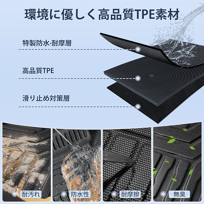 3.【高品質材&安全安心】環境に優しい高品質のTPE素材を使用し、無臭、耐汚れ、防水性に優れてヴェルファイア40系カーマットです。それに、長く使用しても弊社のVELLFIRE40マットの形が崩れにくく、頻繁な乗り降りにも大丈夫です。安全的なTPE素材を採用し、特にお子様がいる家庭に安心してご利用いただけます。