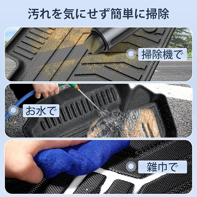 4.【立体設計&掃除簡単】汚れを気にせず掃除機やお水で、雜巾とか簡単に掃除できるし、常に車内をきれいに保つことが可能です。そして、普通の絨毯マットと比べると弊社の防水マットは縁高の3D立体構造なので、泥や水の侵入を防ぎ、車内を清潔に保ちます。汚れや水滴が気になる方に最適で、日常使いからアウトドアまで色々なシーンでもにお使いいただける新型ヴェルファイア40系マットです。