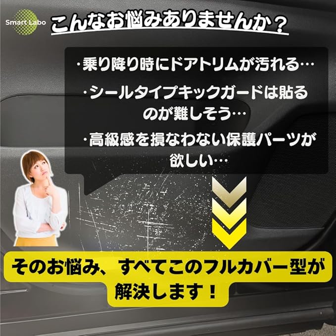 【素材・構造】 高耐久PUレザー採用。 防汚・防傷性に優れ、乗降時のキズ・靴汚れからドアトリムを広範囲で保護。 裏面には強力両面テープを全面配置し、長期間剝がれにくく安定した密着を維持。