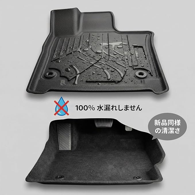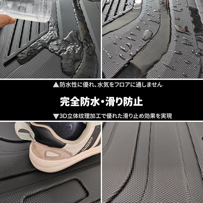 4.【滑り防止・防水設計】:アルファード/ ヴェルファイア40系 フロアマットの表面には独自の滑り防止テクスチャーが施されており、足元の安定性を高め、運転の安全性を向上させます。また、TPE素材は優れた防水性能を持ち、雨水や泥などの液体の浸透を効果的に防ぎ、車内を清潔に保ちます。