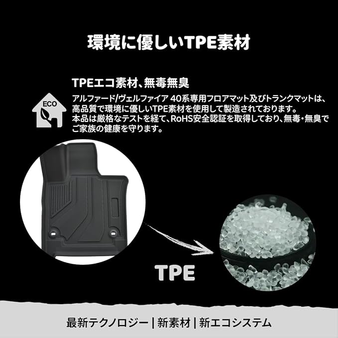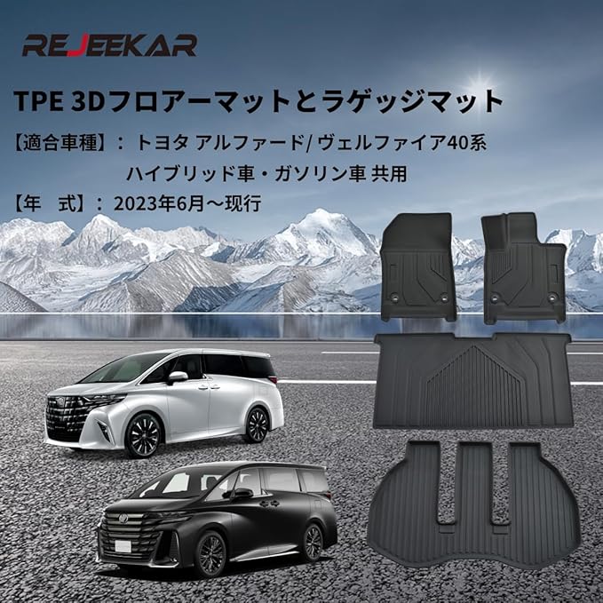 2.【専用設計】:REJEEKAR TPEフロアマットは、トヨタ アルファード/ ヴェルファイア40系 右ハンドル車専用に設計されており、 40系 フロアマットが車内のスペースに完璧にフィットします。すべての角落をしっかりと保護し、滑りやズレを防止し、最高のドライビング体験を提供します。