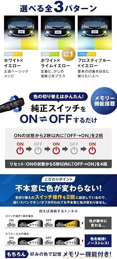 【純正スイッチ操作のみで完結する2色切り替え】特別な配線やスイッチ増設は不要で、純正フォグランプスイッチを「OFF→ON」と操作するだけで簡単に発光色を変更できます。エンジンを切っても前回の点灯色を記憶する「メモリー機能」を搭載。さらに、トンネル通過時などの意図しない色変更を防ぐため、スイッチ操作を2回行うことで色が切り替わる「誤作動防止仕様」を採用しました。ストレスフリーな操作性と高い利便性を両立し、状況に合わせたライティングを快適にお使いいただけます。
