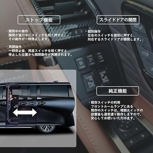 <ストップ機能> 開閉中にスイッチを短く押すと、その動作が一時停止します。 お好きな位置で停止させることができます。 <純正機能> フロントルームランプにある既存のスイッチは、増設スイッチ設置後も通常通り動作いたしますので安心してお使いいただけます。 <LEDライト搭載> 夜間でもLEDライトが点灯するのでスムーズに操作することができます。
