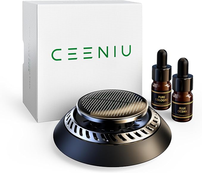 CEENIU 車用芳香剤 高級カー用品 2025新型 アルミ合金製 ソーラー回転式 静音 フランス産天然香料 エッセンシャルオイル2本付き F21 カーフレグランス ギフト Car Air Diffuser