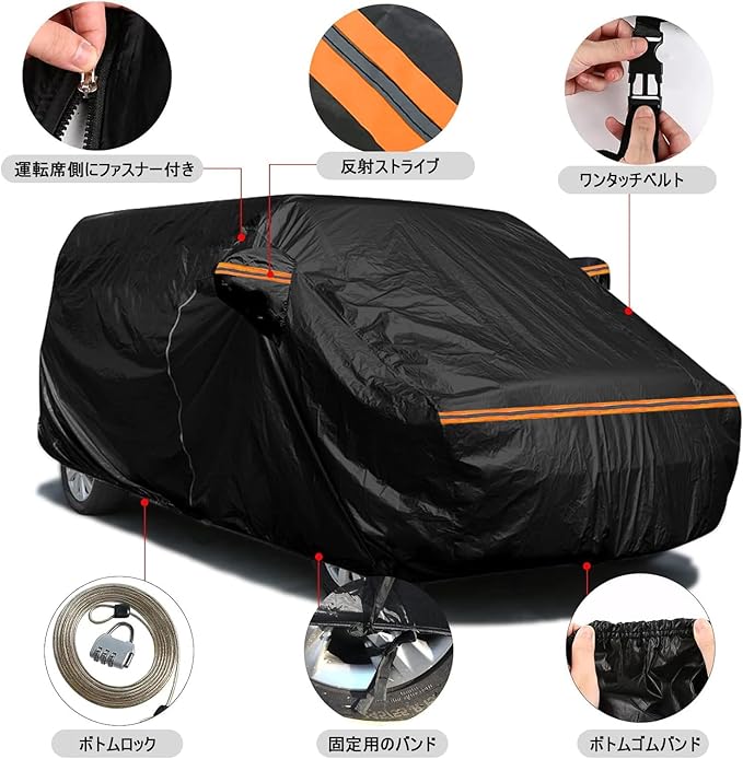 【より優れたデザイン】ボディカバーは黒で、周りには蛍光反射ストリップがあり、夜間の視認性を高めます。また、運転席側ドアはファスナーが付いて、簡単に開閉することが可能です。車内へアクセスできるので、忘れ物をしても安心です。