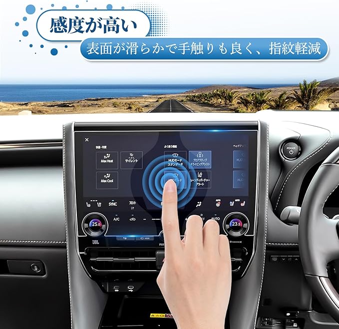 【指紋防止・カースクリーン保護】指紋防止コーティングを施し、指がフィルムに触れても指の油分が残りにくく、ヴェルファイア 40系の後席ディスプレイを保護します。 指紋・油汚れ・水汚れに強く、汗・皮脂・化粧品等が画面に付いても拭き取るだけです。 自由かつ快適に操作できます。 ほこりの多い環境では、ほこりによる液晶画面の汚染を防ぎ、スクリーンの清潔感を効果的に保護し、耐用年数を延ばします。