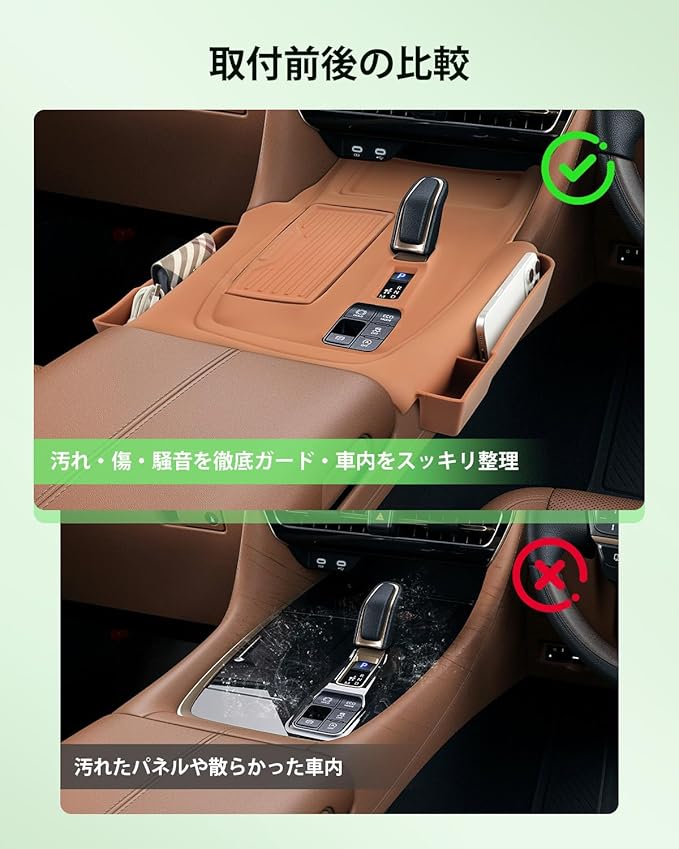 【防音・滑り防止・キズ防止】柔らかいアルファード40系専用に設計されたシフトパネル用サイドポケット付きトレイは指輪や時計などの硬い物による傷からボディパネルを効果的に保護します。運転中にキーホルダーやコインなどがぶつかることで発生する「カチャカチャ」という音を吸収します。表面の盛り上がったエッジと滑り止めストライプが,緊急ブレーキ時にこぼれたコーヒーを吸収し、液体がパネルに染み込んで汚れるのを防ぎます。