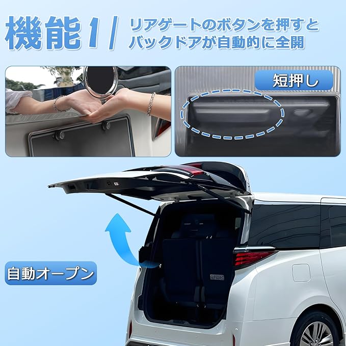 3.【簡単操作】▲自動オープン:リアゲートのボタンを1回押すとバックドアが自動的にオープンします。▲自動クローズ:リアゲートの裏のスイッチを長押しすると自動的にクローズします。▲一時停止:リアゲートのボタン/サイドボタン/リアゲート裏のスイッチを押すと、オープンの途中でリアゲートが一時停止することができます。▲一時停止の後は:①リアゲートのボタンを再び押すとドアが再開します。②リアゲート裏のスイッチまたはサイドスイッチでドアオープンまたはクローズができます。