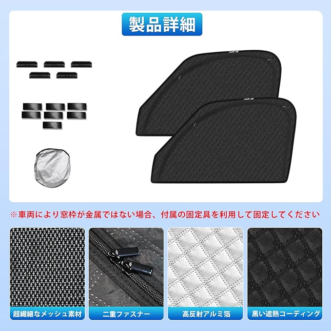 【耐久性が高い&高品質素材】生地に厚みがあり、耐久性が高く、動きの良いファスナーを開けるとメッシュになり風を通すことができます。車内側(三層遮光生地) 1層目:高密度アルミ箔反射層、2層目:特殊な断熱 保温コットン、3層:紫外線カットの黒いコーディング。表面に銀塗り素材を採用し、裏面に黒色の断熱材を採用することで、夏は強い日差しを反射して車内の温度上昇を防げます。冬は窓からの冷気をシャットアウトので暖房効果もアップ!一年中使えるカーサンシェードです。車外側(網目が細かいブラックメッシュ生地)空気を通しつつ蚊や虫などの侵入を防ぎます。